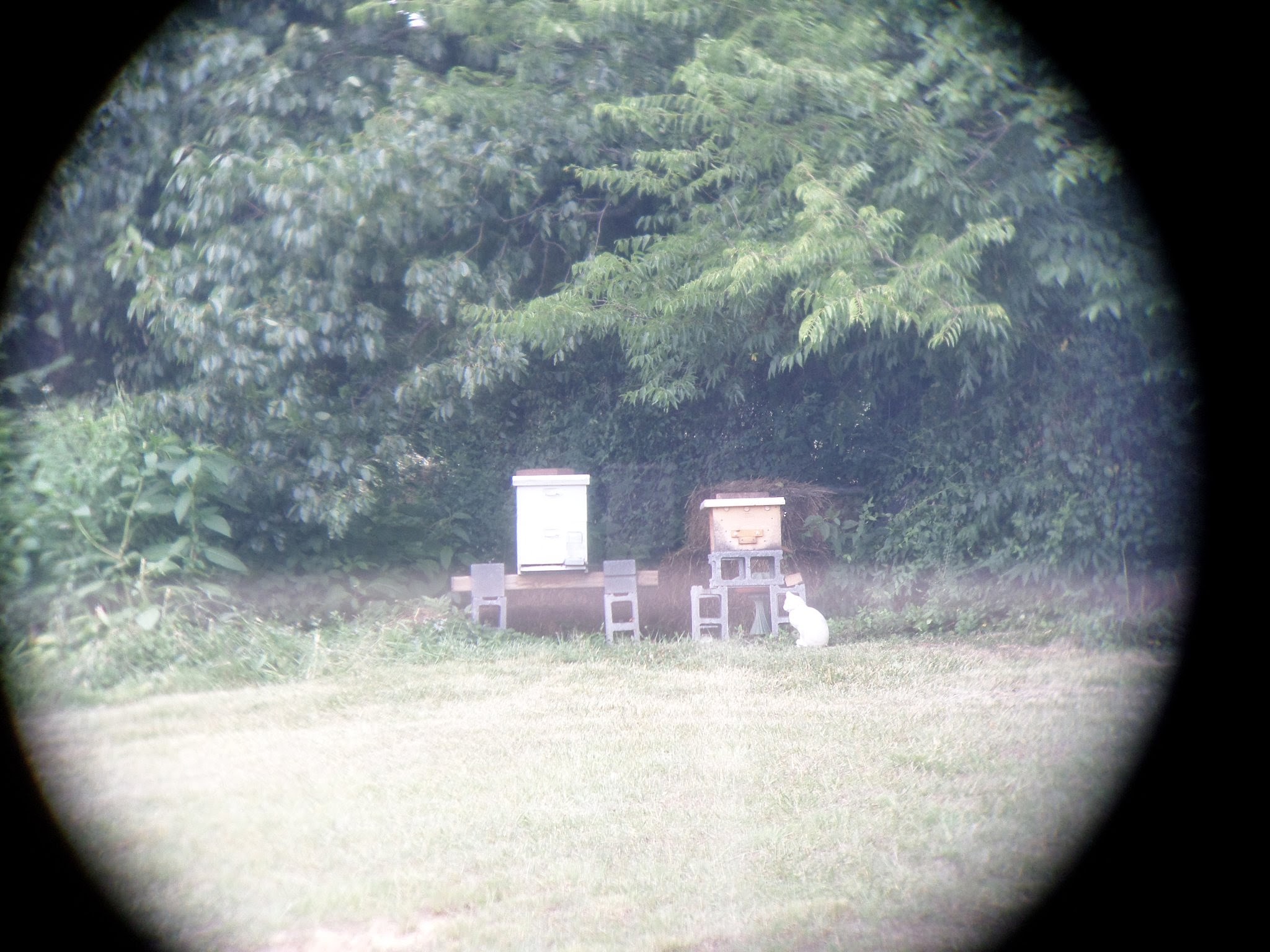 My husband is completely embarrassed by my bee-geekery and never more so than when I hung this bracket up in the kitchen. I used one of those little brackets that security cameras are mounted on and instead put my beloved Bushnell PermaFocus bird binoculars on it. It is mounted next to the window that has a direct view of the apiary.