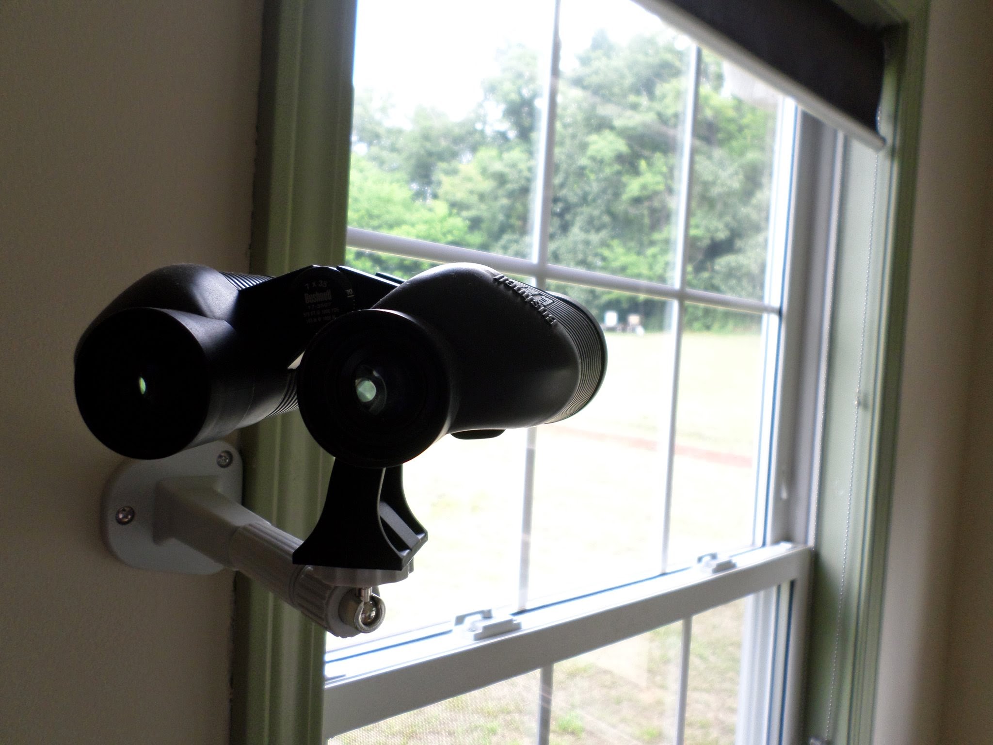 Attached to the white camera bracket arm is an upright black tripod mount made for cameras and binoculars. This tripod mount holds the optics up and off of the arm bracket.
