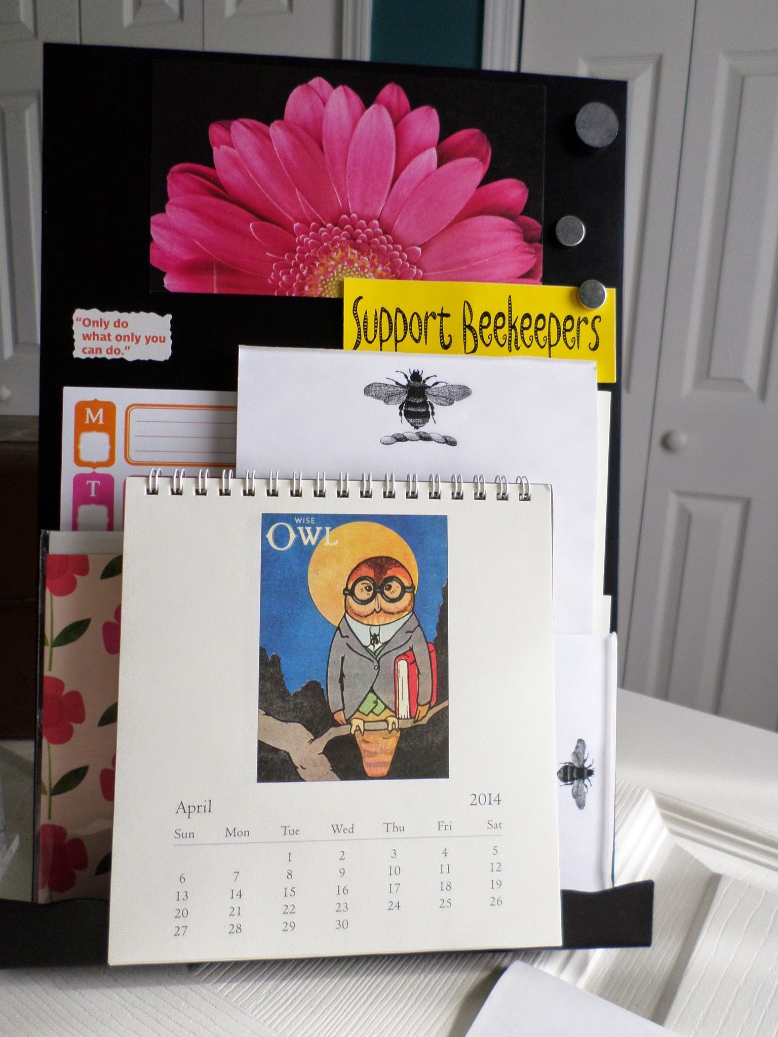 Another Pier One find, this is a metal desk easel. It has a tray along the bottom that is great for stuffing all manner of paperwork. A few more homemade magnets adorn this collage.