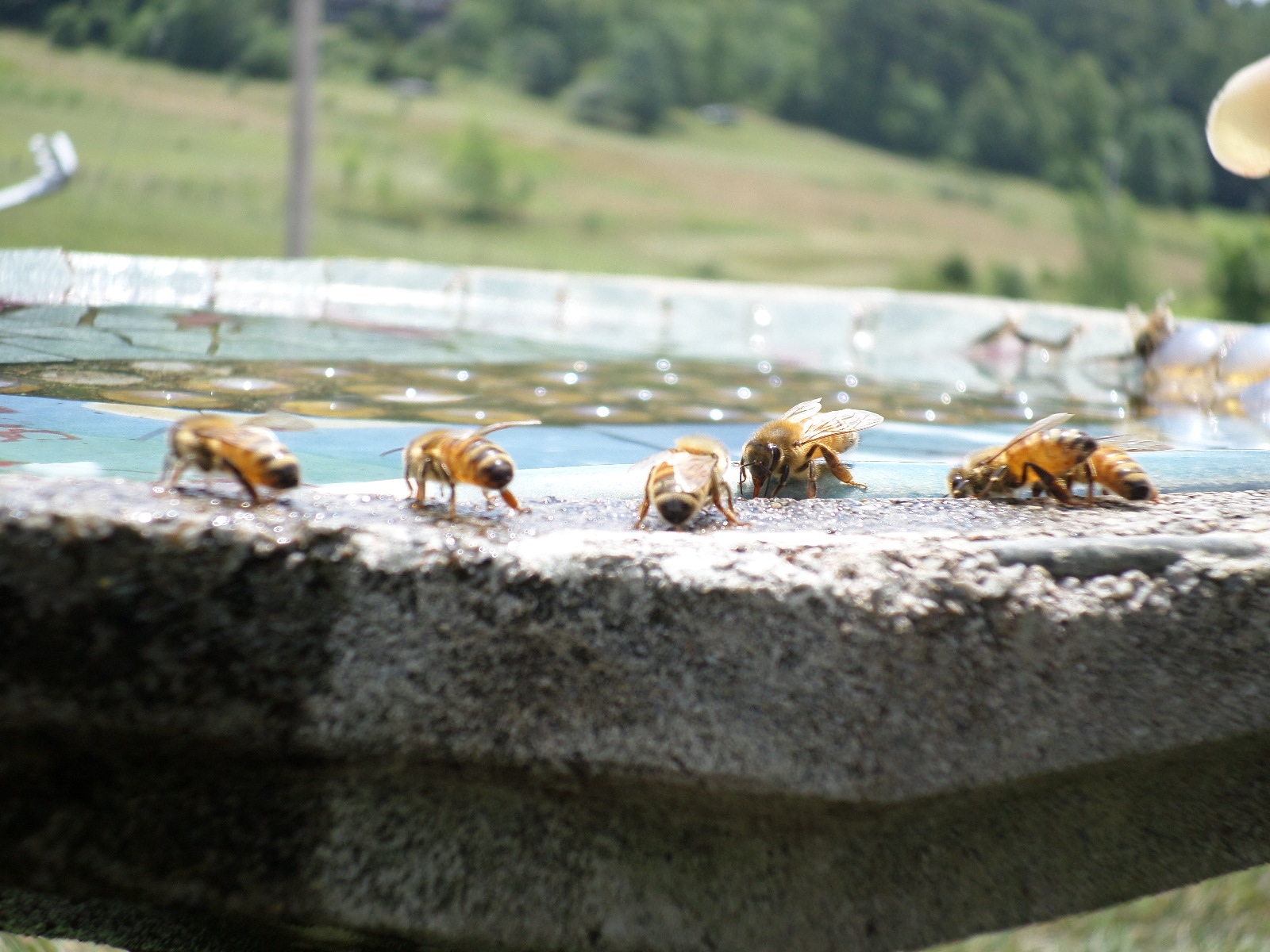 It’s like the public pool on a hot summer day. See the little bee in the background on the right? She is dipping her little tongue down in the water with her wings up (I assume for balance).