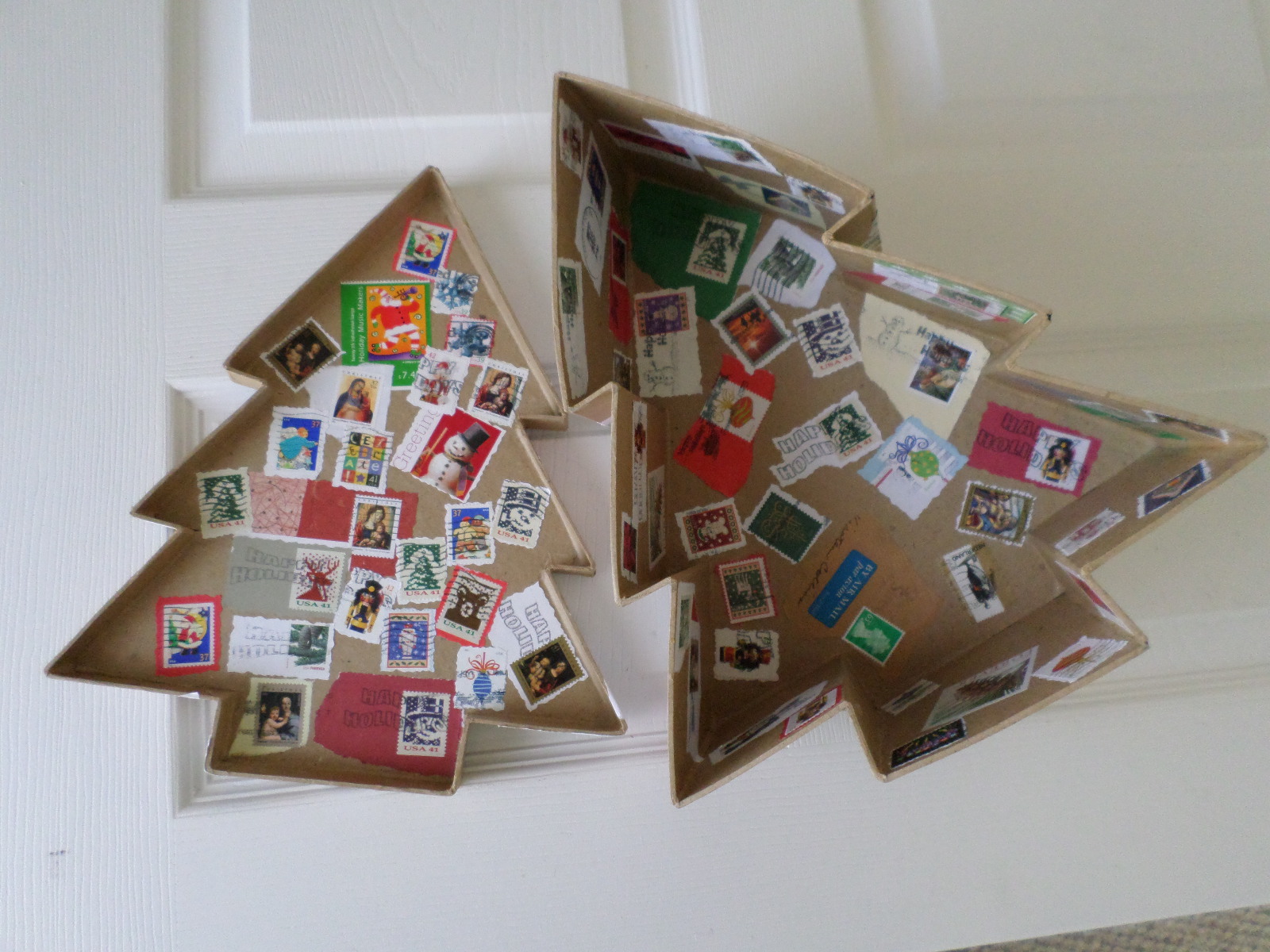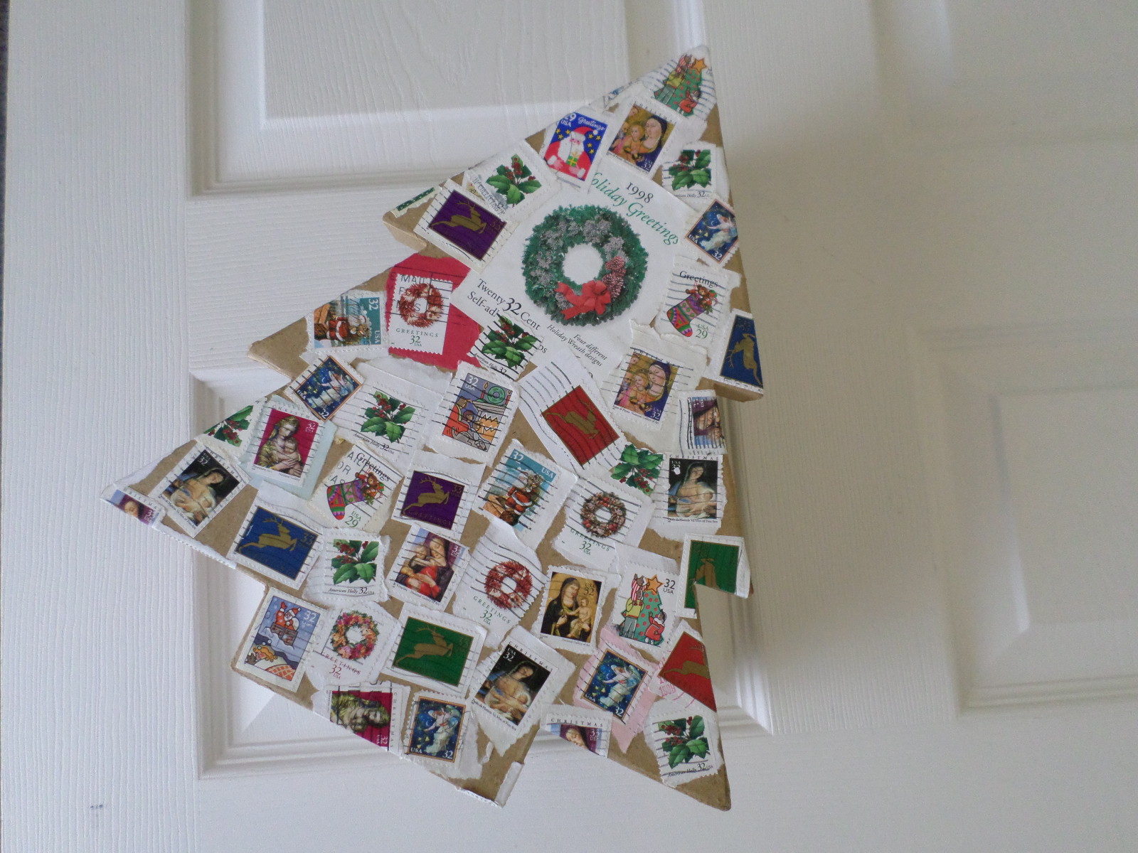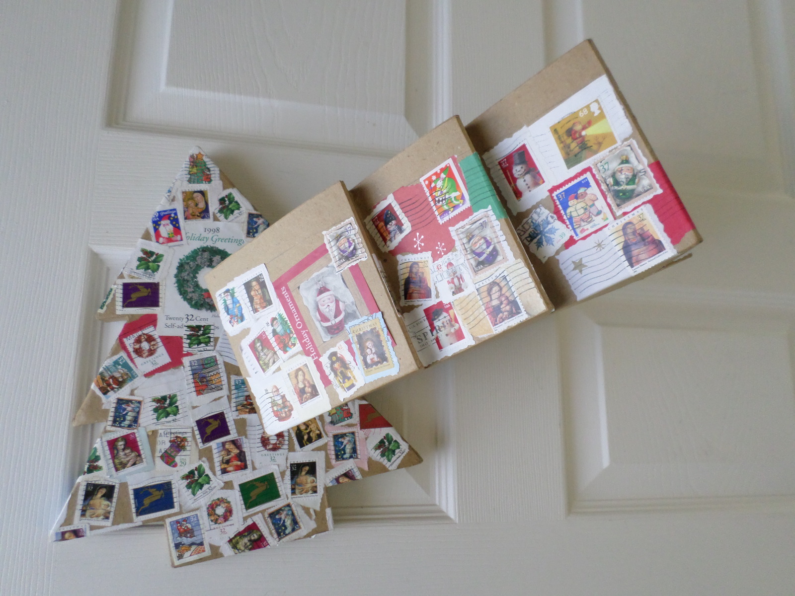 I leave this box open in the foyer at Christmastime and add all the cards that arrive each day. Before I store the holiday decorations I spend an afternoon updating my stamp box. I figure I have one or two more years before this box is full and then I’ll do a wooden bowl or box and maybe even incorporate a few pages from some old hymnals onto the new receptacle.