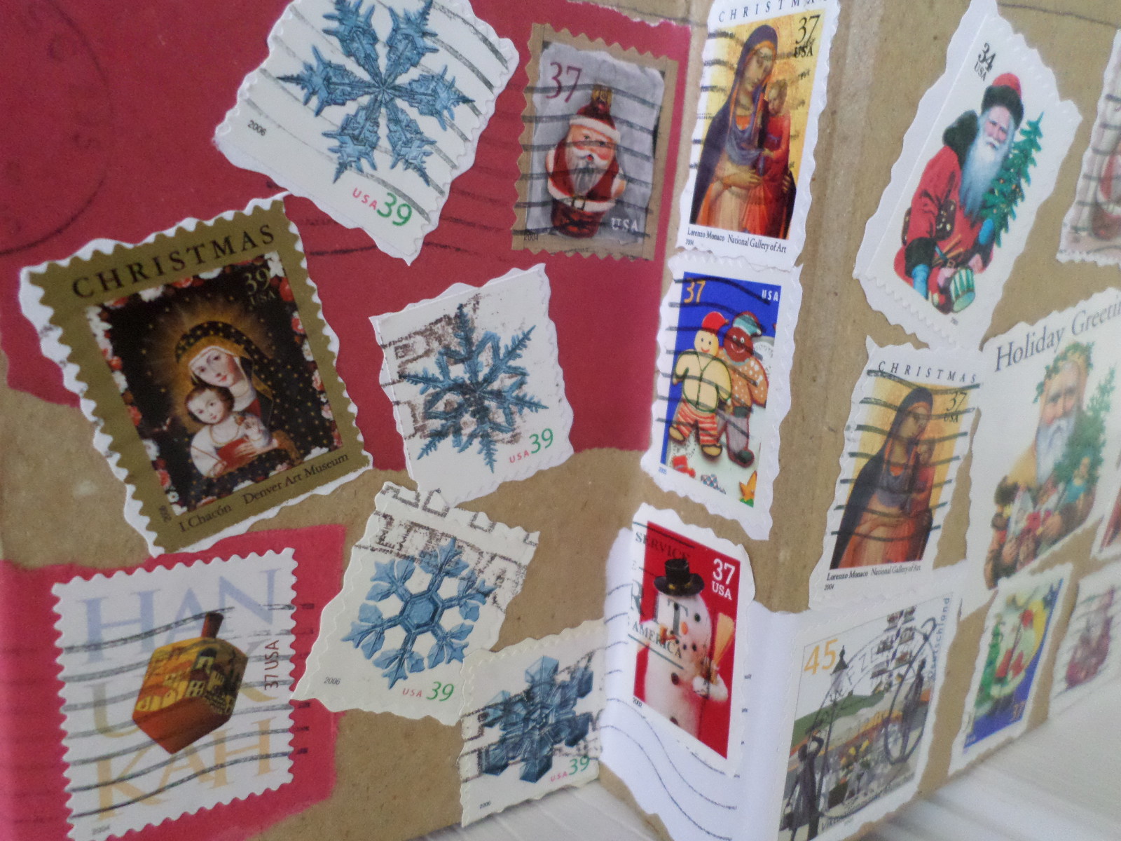 Simply cut or tear the stamps from the envelopes (leave a little envelope if it’s a pretty one) and then glue them on your selected item. When finished, you can apply a few coats of Mod Podge as a sealant.